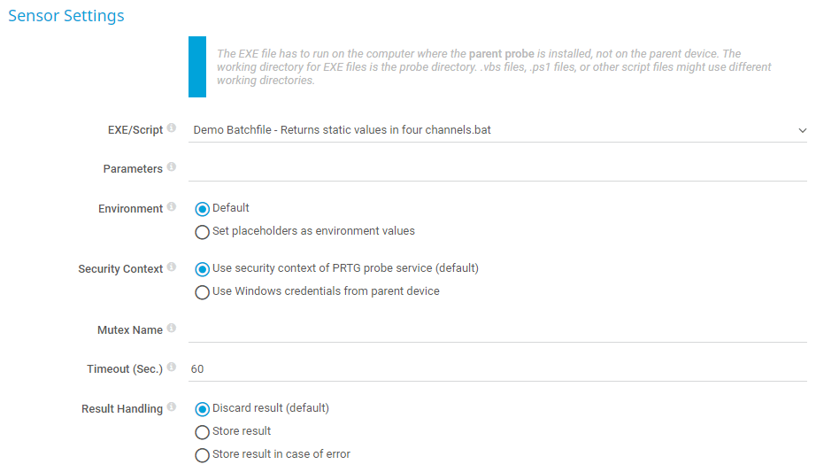 Set placeholders as environment values: Define if command-line parameters of PRTG are also available as environment parameters in your executable or script. For example, you can read and use the current host value of the parent device from within your script. This option can pose a security risk because credentials are exposed in several variables. It is not possible to use the environment variables in the parameters setting for batch scripts (.bat) for security reasons.