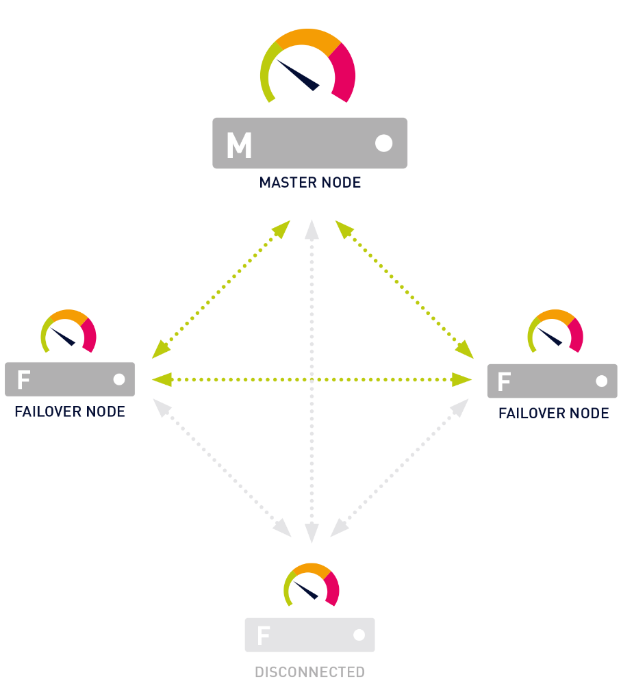 A cluster consists of at least two cluster nodes: one master node and one or more failover nodes, where up to four failover nodes are possible. Each cluster node is a full PRTG core server installation that can perform all of the monitoring and alerting on its own.