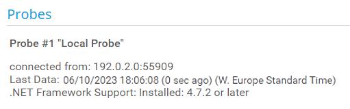 Shows information about the connection status. If the probe is connected, the field shows the source IP address and port number used by the probe. For the local probe, the IP address is always 127.0.0.1. You also see information about the date when the last data packet was received from the probe.